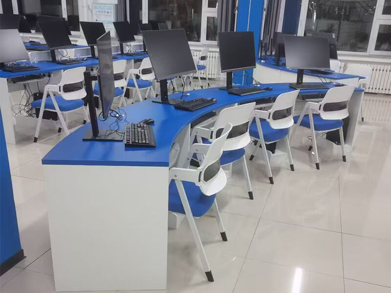 Our curved computer desks (also known as L-shaped corner desks or arc-shaped gaming desks) are engineered to maximize space and encourage collaboration. The smooth, contoured design allows easy placement in corners or rows, while providing ample room for monitors, keyboards, and teaching aids. Available in a range of colors like fresh blue and crisp white, these desks can be customized in size, shape, and finish to match your school’s layout and branding.